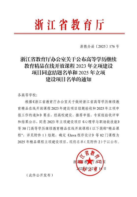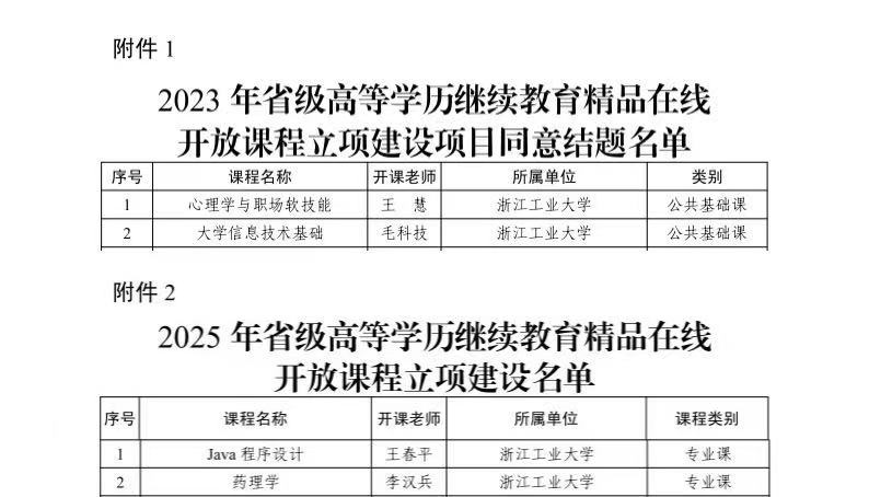 近日,浙江省教育厅下发《关于公布高等学历继续教育精品在线开放课程2023年立项建设项目同意结题名单和2025年立项建设项目名单的通知》(浙教办函〔2025〕176 号)。我校王慧老师的《心理学与职场软技能》、毛科技老师的《大学信息技术基础》顺利通过结题验收,王春平老师的《JAVA程序设计》、李汉兵老师的《药理学》成功获批2025年立项建设。结题与立项课程数量位居全省本科高校前茅。